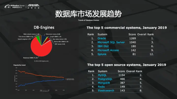 开源数据库的出现影响了整个数据库市场的格局和版图,也为阿里巴巴在数据库市场提供了一个重大的机会。经过十年的时间,阿里云数据库做到了“全国第一,全球领先”。当然,影响数据库格局的重要因素除了开源之外,还有云计算的兴起。