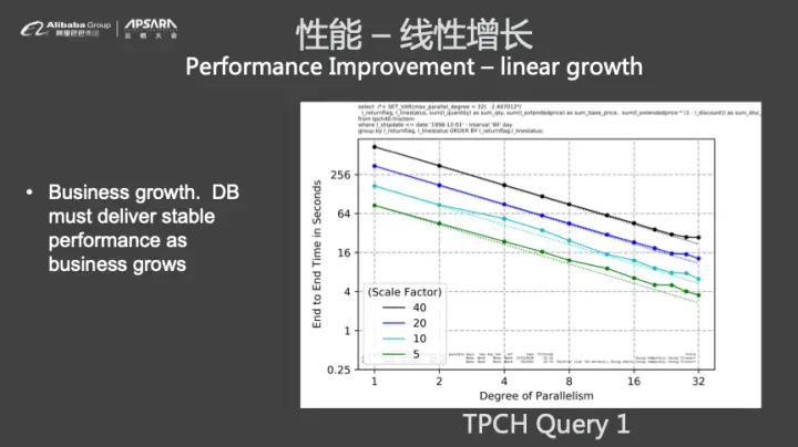 与此同时,并行查询还具有线性增长的能力,这意味着当数据量大的时候,只需要给与足够多的CPU和内存,处理能力就能够实现线性增长。在TPCH 5G、10G、20G以及40G四种数据量维度下,不断调整并发度,而性能曲线基本上出现线性增长趋势。