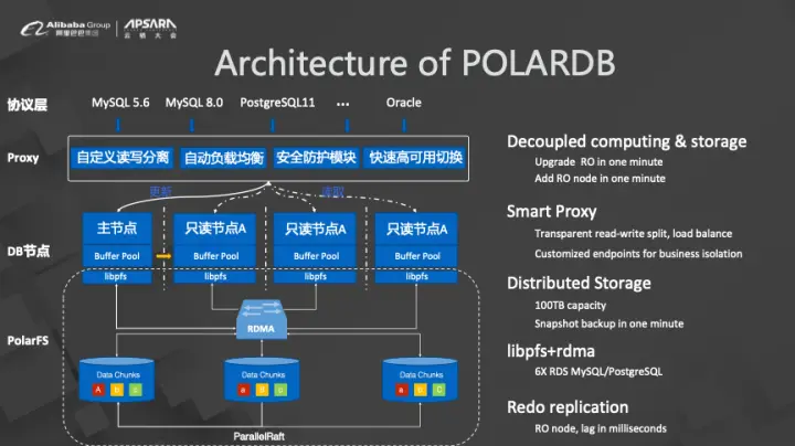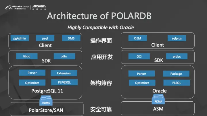 POLARDB Oracle版本从几个层次做了兼容,首先是操作界面能够完全兼容,对于DBA而言迁移成本基本为0。其次,对于应用开发而言,目前POLARDB使用的PG开源的SDK。而对于引擎架构而言,POLARDB的架构基本和Oracle类似。目前使用的存储也是和ASM对标的。