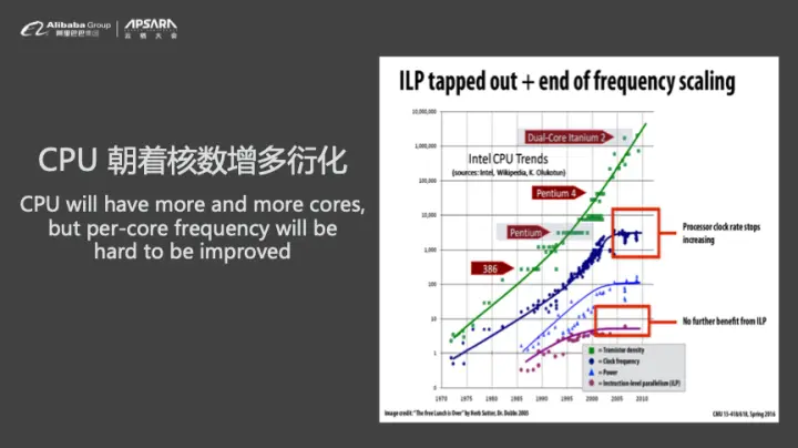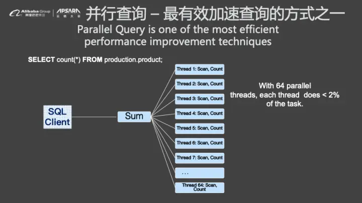 此外,业界的一个趋势CPU单核频率达到了瓶颈,增长放缓。而我们对于计算能力的诉求是永无止境的,因此CPU只能向着多核演进。而MySQL属于传统事务型数据库,其无法并行执行单条Query,因此无法充分利用多核的作用。业界的通用做法就是并行查询,如今几乎所有商业数据库都提供并行查询的能力,将任务分摊给多个线程并行计算,大幅度缩短计算时间。