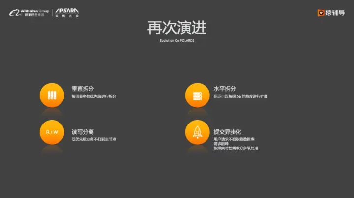 这样的方案运行了半年,也遇到了三点主要的问题:处理能力被高估、缺乏隔离和缺乏扩展性。于是猿辅导借助POLARDB实现的数据库架构的再次演进,实现了数据库的垂直拆分、水平拆分、读写分离和提交异步化。