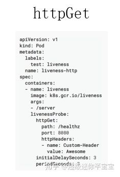 那再来看一下这个 httpGet,httpGet 里面有一个字段是路径,第二个字段是 port,第三个是 headers。这个地方有时需要通过类似像 header 头的一个机制做 health 的一个判断时,需要配置这个 header,通常情况下,可能只需要通过 health 和 port 的方式就可以了。