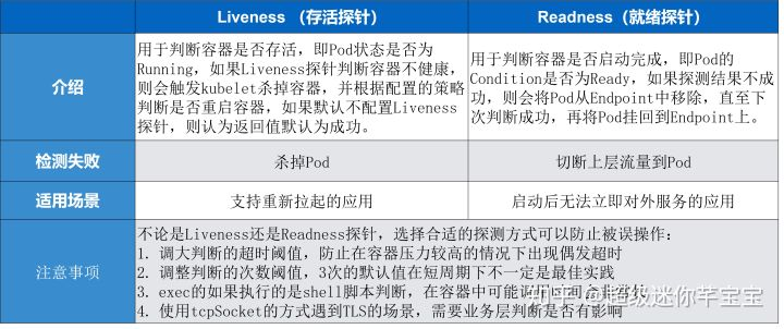 在使用 Liveness 指针和 Readiness 指针的时候有一些注意事项。因为不论是 Liveness 指针还是 Readiness 指针都需要配置合适的探测方式,以免被误操作。