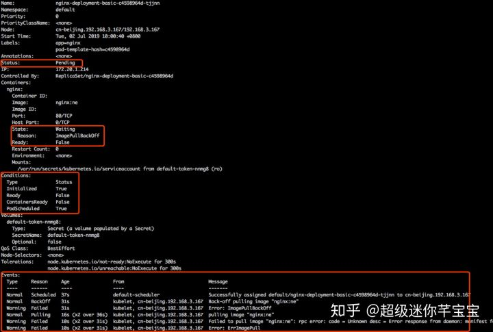 那第二个状态就是 pod 可能会停留在 waiting 的状态,pod 的 states 处在 waiting 的时候,通常表示说这个 pod 的镜像没有正常拉取,原因可能是由于这个镜像是私有镜像,但是没有配置 Pod secret;那第二种是说可能由于这个镜像地址是不存在的,造成这个镜像拉取不下来;还有一个是说这个镜像可能是一个公网的镜像,造成镜像的拉取失败。