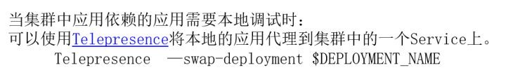 - 远程调试的一个策略,如果想把本地的应用代理到远程集群,此时可以通过 Telepresence 这样的工具来实现,如果想把远程的应用代理到本地,然后在本地进行调用或者是调试,可以用类似像 port-forward 这种机制来实现。