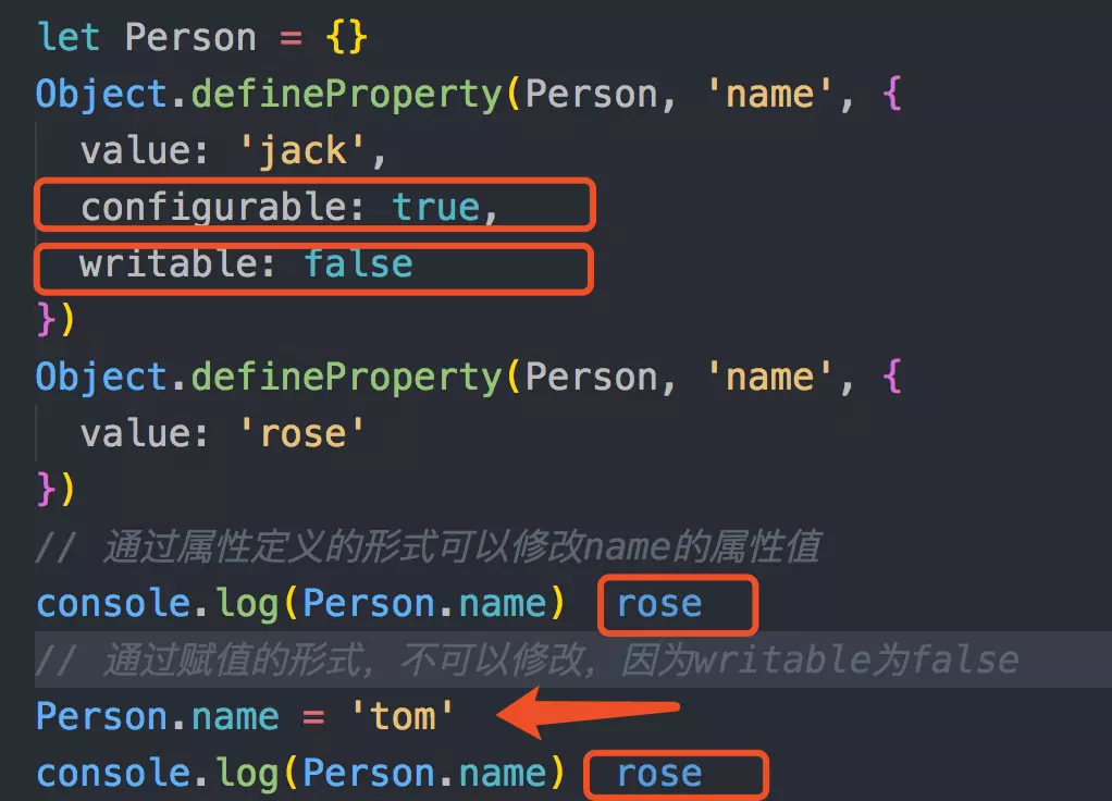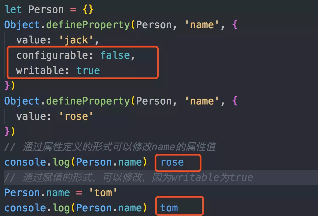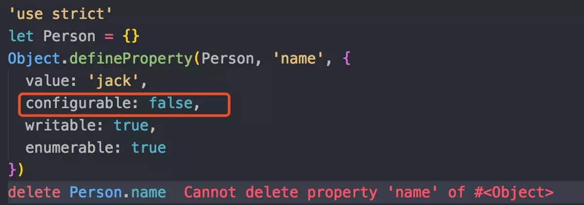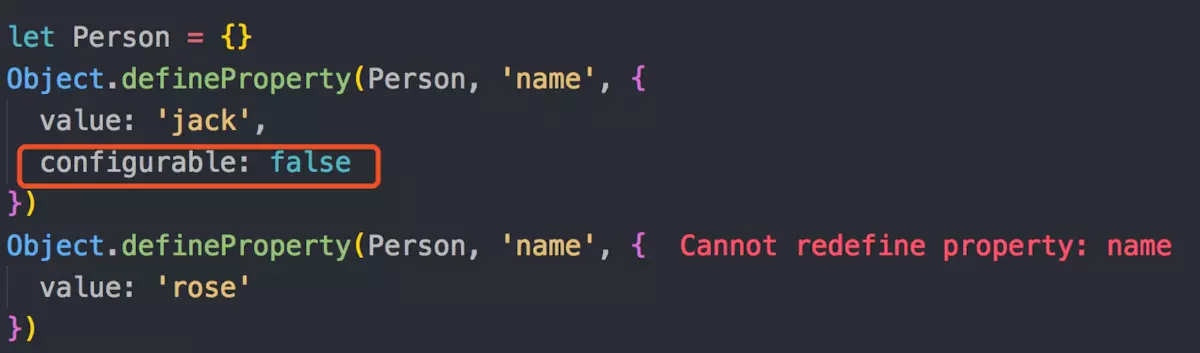 - configurable: false 时,不能删除当前属性,且不能重新配置当前属性的描述符(有一个小小的意外:可以把writable的状态由true改为false,但是无法由false改为true),但是在writable: true的情况下,可以改变value的值