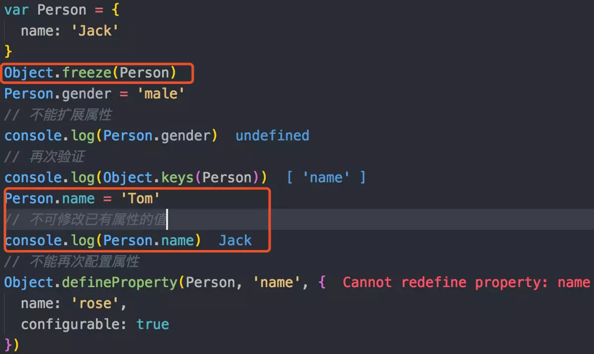 这个方法是你可以应用在对象上级别最高的不可变性,它会禁止对于对象本身及其任意直接属性的修改(但是这个对象引用的其他对象是不受影响的)