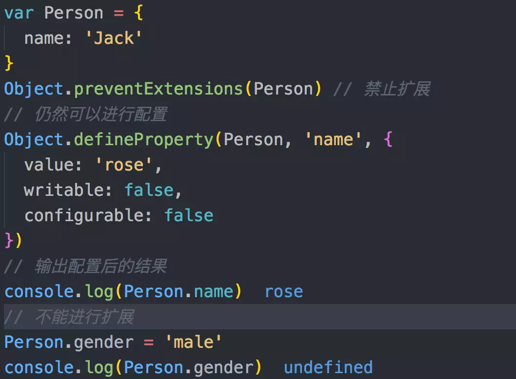 如果你想禁止一个对象添加新属性并且保留已有属性,就可以使用Object.preventExtensions(...)