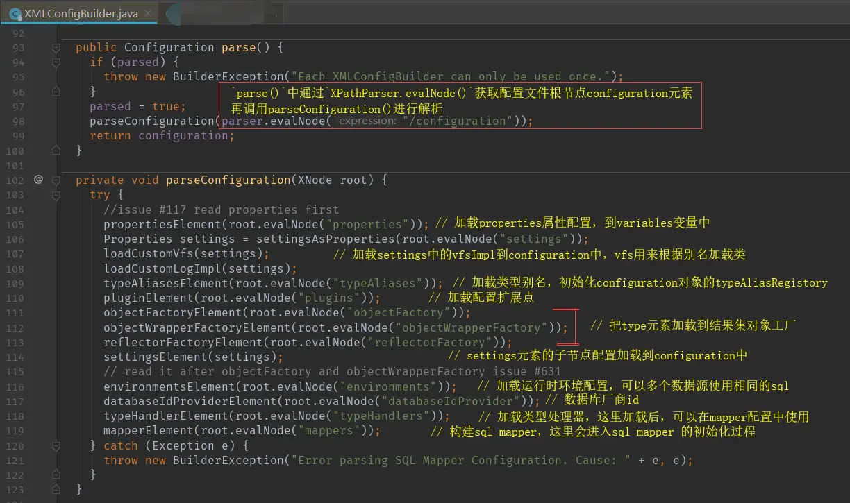 XmlConfigBuilder.parse()方法将配置文件初始化到configuration中