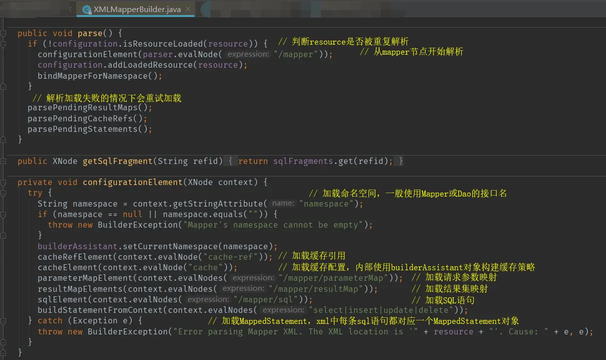 Xml**Builder类是构建器,用来构建一个对象 XMLConfigBuilder的产物用来加载MyBatis的配置文件XMLMapperBuilder的产物用来解析MyBatis中的映射文件XMLStatementBuilder的产物用来解析映射文件中的SQL语句