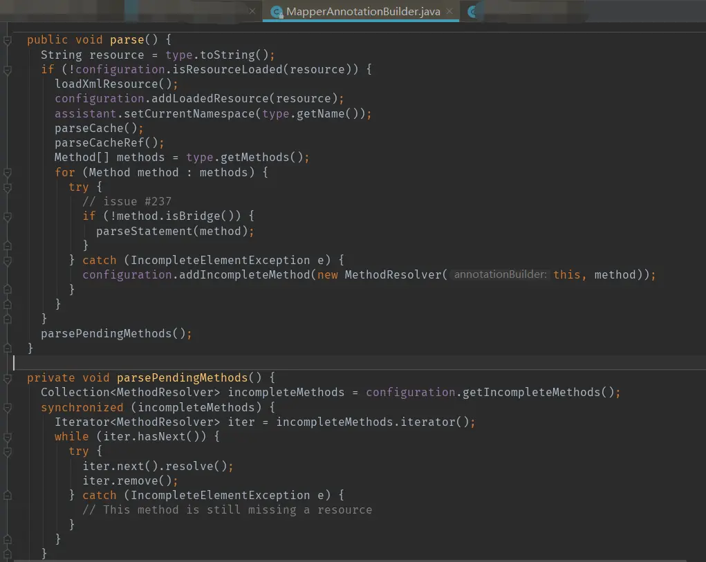 MapperAnnoationBuilder跟XMLMapperBuilder有些类似,不过构建的内容略少,且需要使用反射来构建SQL Mapper