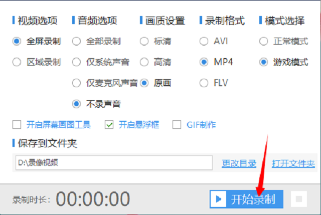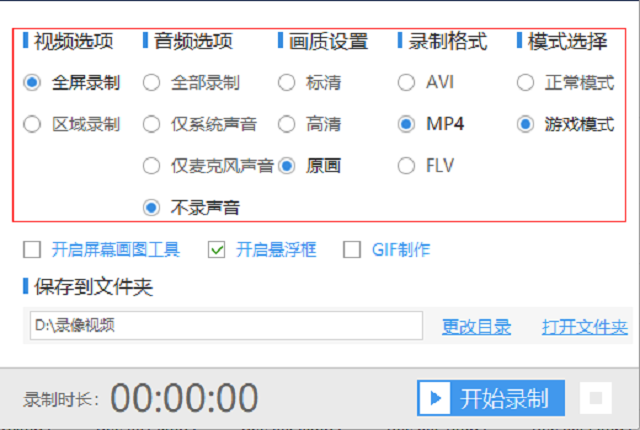 2、在录制屏幕视频之前,要把一些录屏的参数设置好,有视频、音频、画质、格式和模式。视频可以设置成全屏录制或区域录制,音频可以设置成录制全部声音或者仅录制系统声音、麦克风声音。画质有三种选择:标清、高清和原画,格式也有三种选择:AVI 、MP4、 FLV。最后一个模式有游戏正常模式两种选择。