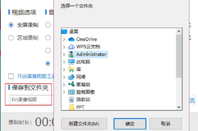 3、上面的这些参数设置好了之后就要对视频保存的位置进行选择了,在屏幕录制完成后会生成一个视频,这个位置就是该视频所要保存的文件夹。