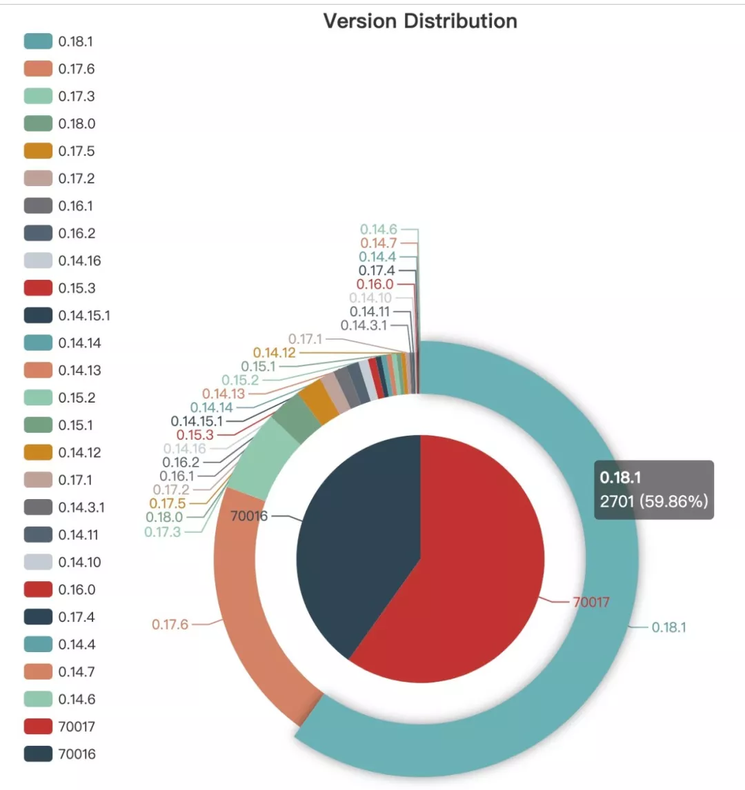现在V0.18.1版本已经有59.86%的节点完成升级,详细节点比例见下图,已经达到硬分叉条件,所有主流交易所已完成硬分叉版本升级