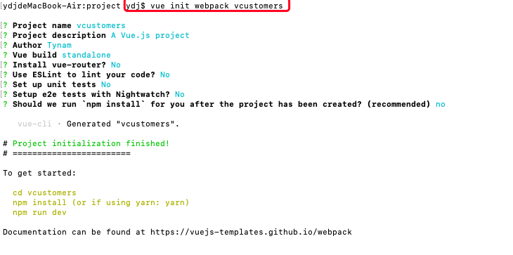 终端中输入:vue init webpack ”项目名称“