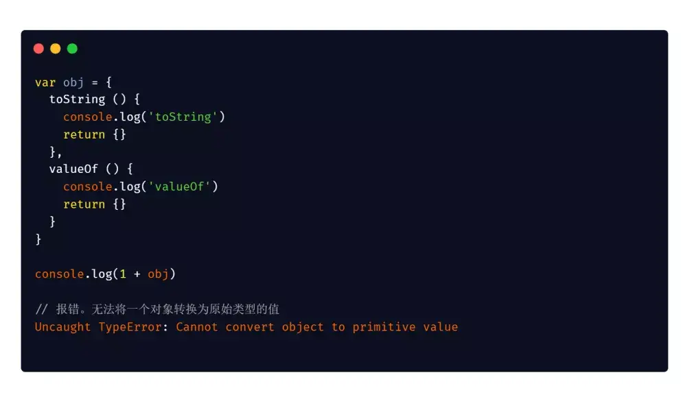 如果调用valueOf返回的不是原始类型的值,会调用toString方法,toString如果返回的不是原始值,就会报错。