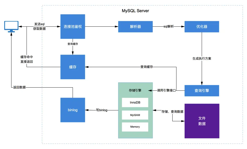 - 存储引擎层,主要包括 MySQL 的各种引擎以及所产生的各种数据、Schema、索引以及日志文件存储,存储引擎层提供了相关的数据查询检索接口与上层进行交互,依据上层生成的执行方案查找、存储数据。