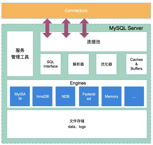 我们的程序通过连接池向 MySQL 发送了一条sql语句,MySQL 就按照要求给我们返回了正确的结果,有时我们不免好奇,这个过程中究竟发生了什么?它是如何工作的?有什么方法可以加速我们的查询?需要解答这些疑问,首先我们需要对 MySQL 的架构体系有所了解。 下图为 MySQL Server 的体系结构: