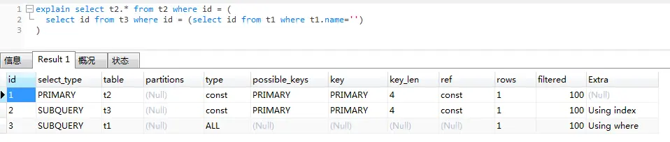 - 2、id不同,id较大的语句先执行,一般发生在子查询的情况下