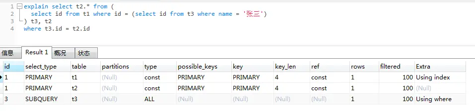 | derivedN | 引用id为N的结果派生表的结果集,派生表可以是一个结果集,例如派生自FROM中子查询的结果 |