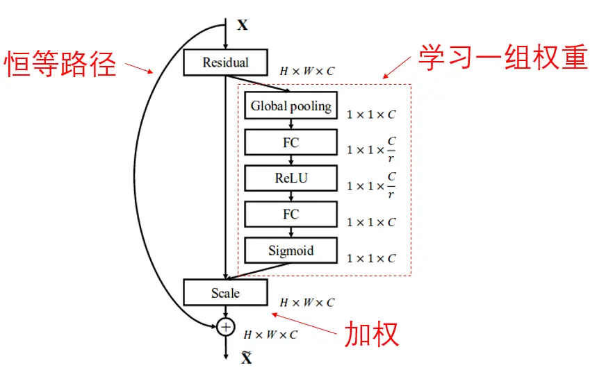 SENet也是一种经典的深度学习方法,它将特征图的全局特征“挤压”成一个小的向量,然后将这个向量输入一个子网络中,利用这个子网络获得一组权重,对特征图的各个通道进行“重标定”,也就是加权。SENet可以和ResNet相结合起来。在这个时候,SENet的基本模块如下图所示: