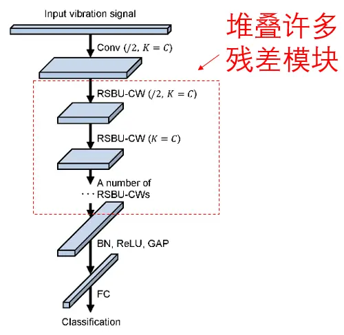 深度残差收缩网络的整体网络结构与传统的ResNet和SENet是相同的。