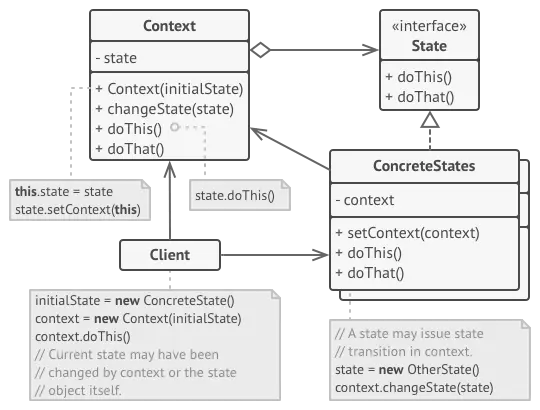 这种结构看起来类似于“策略”模式,但有一个关键的区别。在状态模式中,特定状态可能彼此了解,并开始从一个状态过渡到另一个状态,而策略几乎永远不会彼此了解。