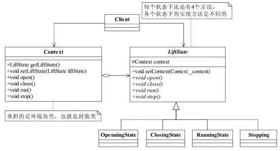 它的核心是封装,状态的变更引起了行为的变更,从外部看起来就好像这个对象对应的类发生了改变一样。状态模式的类图如图所示。