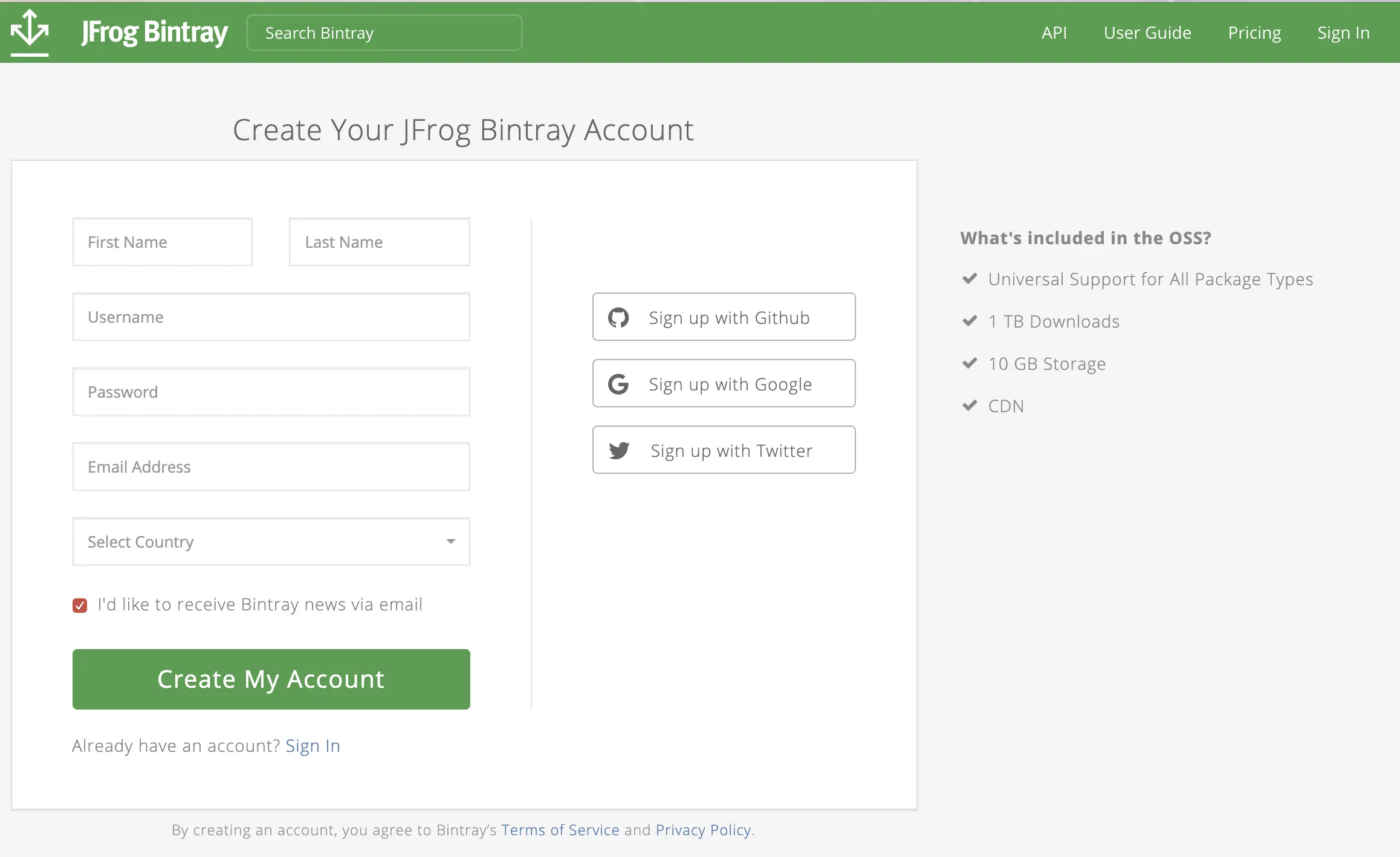 第一步首先是注册Bintray Open Source 账户,注册地址是 Create Your JFrog Bintray Account bintray.com/signup/oss, 请注意不要去Bintray主页注册为企业账户,否则删除账户需要在3个月后试用时长过期后才可以申请。