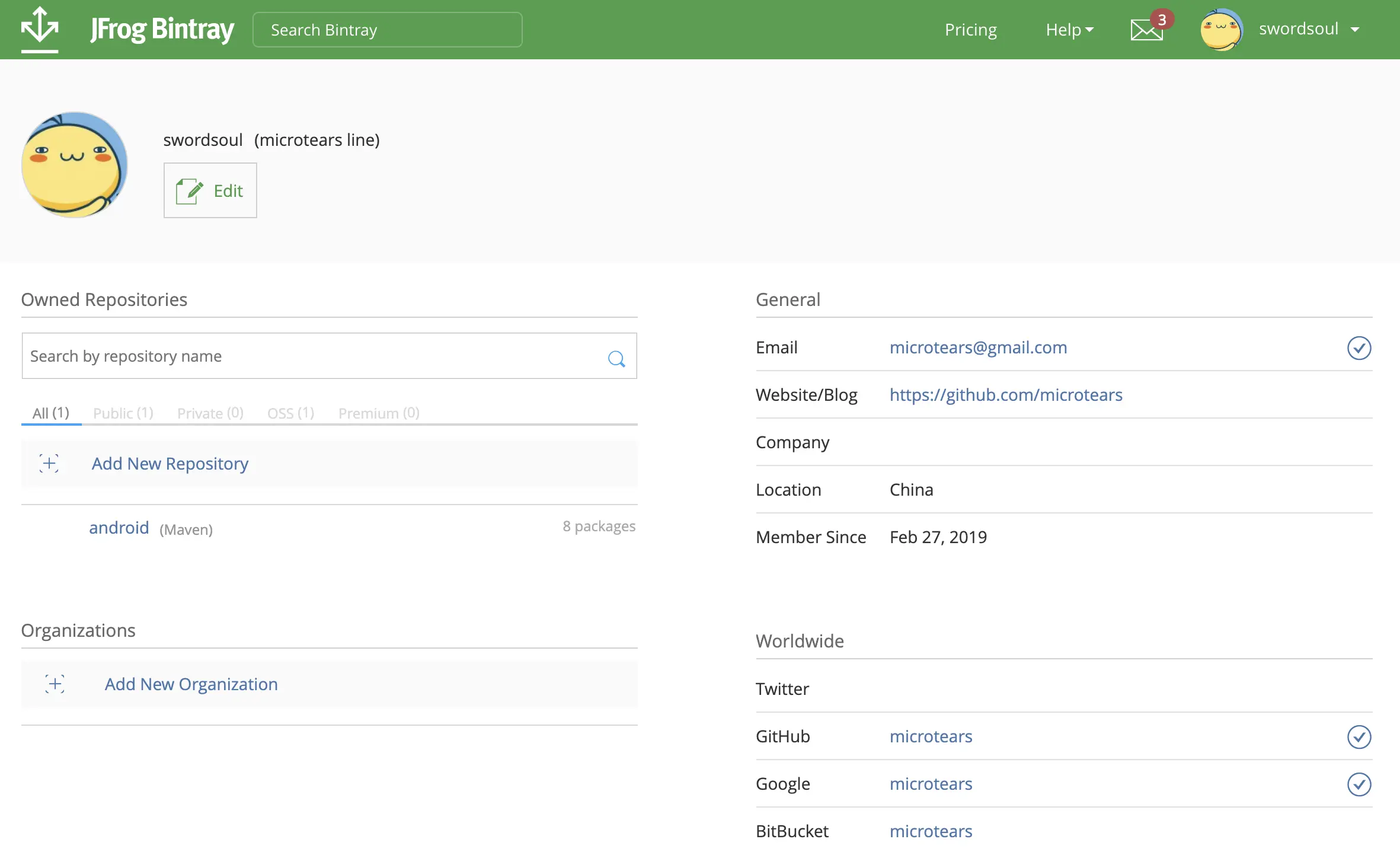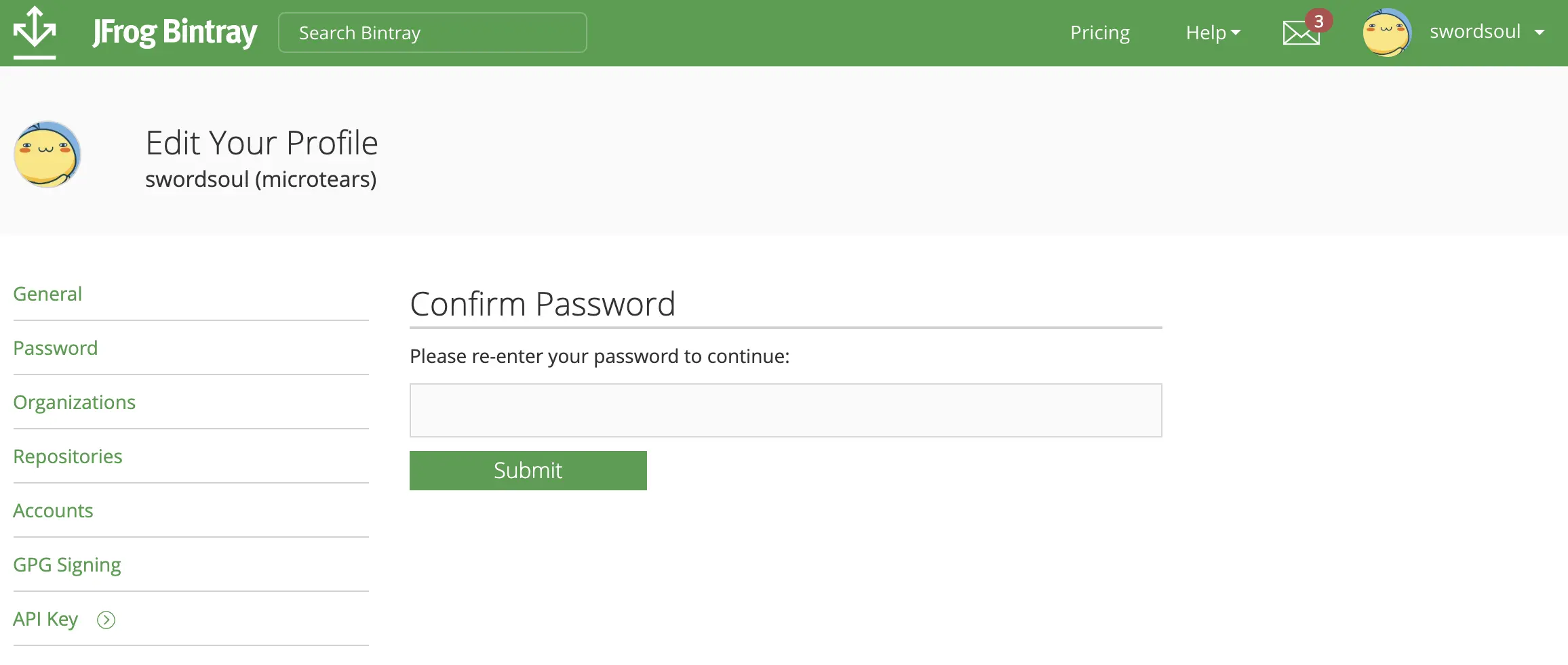 在bintray个人页面右上角头像处,点击Edit Profile进入个人信息编辑页面后,点击左下角的API Key, 会提示输入密码,输入密码后点击Copy To Clipboard就可以得到你自己的bintray api key。