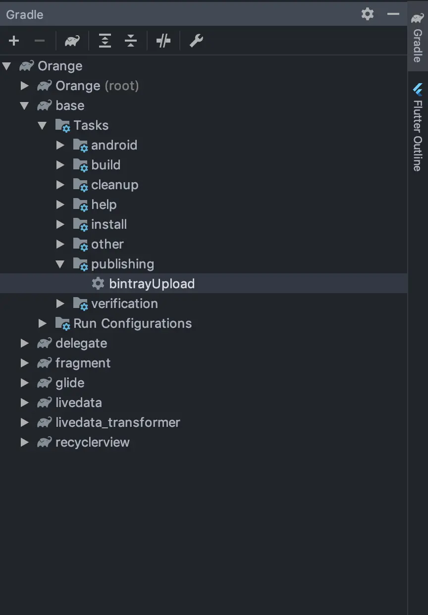 选择侧边栏中的gradle,然后导航至需要上传的module下,打开Tasks/publishing/bintrayUpload,双击执行任务即可。