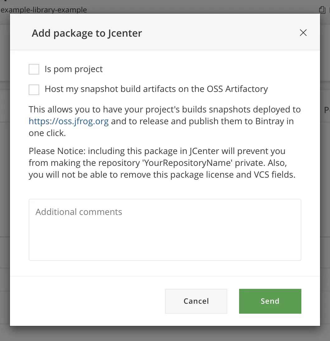 点击Add to Jcenter按钮后,此时会弹出如下弹窗: 在填写相关信息后,点击Send,等待申请通过后,你的仓库便会被同步到Jcenter。