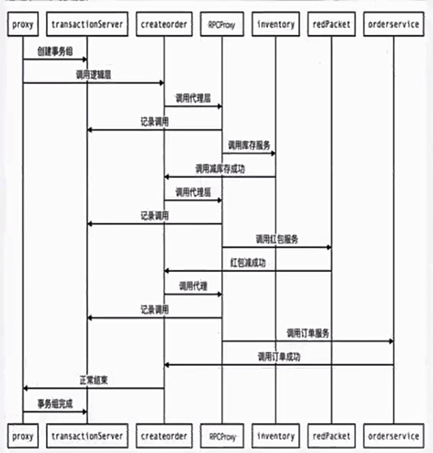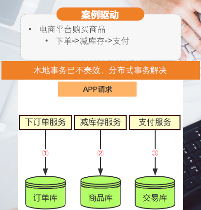 上述步骤2、3、4需要在一个事务中完成。对于传统单体应用而言,实现事务非常简单,只需将这三个步骤放在一个方法A中,再用Spring的@Transactional注解标识该方法即可。Spring通过数据库的事务支持,保证这些步骤要么全都执行完成,要么全都不执行。但在这个微服务架构中,这三个步骤涉及三个系统,涉及三个数据库,此时我们必须在数据库和应用系统之间,通过某项黑科技,实现分布式事务的支持。