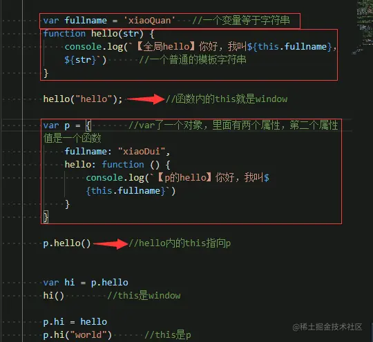 hi() // this ==> window【不要被误导,这是直接调用】