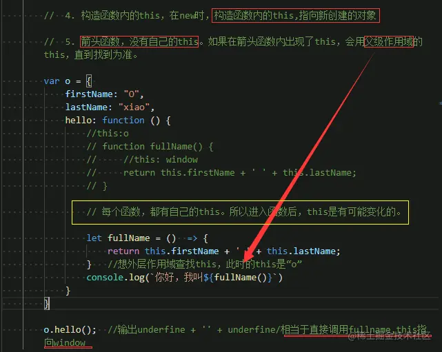 5.箭头函数,没有自己的this。如果在箭头函数中出现了this,会像父级作用域找this,知道找到为止。