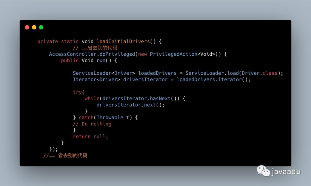 接下来,我们以java.sql.DriverManager为例,看下线程上下文加载器的用法,在java.sql.DriverManager类的下面这个静态块中,是JDBC驱动加载的入口。