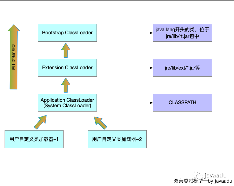 四种类加载器 从JVM的角度看,类加载器主要有两类:Bootstrap ClassLoader和其他类加载,Bootstrap ClassLoader是C++语言实现,是虚拟机自身的一部分;其他类加载器都是Java语言实现,不属于虚拟机,全部继承自抽象类java.lang.ClassLoader。从Java开发者的角度看,需要了解类加载器的双亲委派模型,如下图所示: