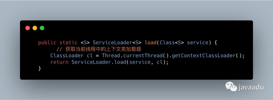 ServiceLoader.load方法的代码如下,JDBC的sqlDriverManager就是这里获得的上下文加载器来驱动用户代码加载指定的类的。