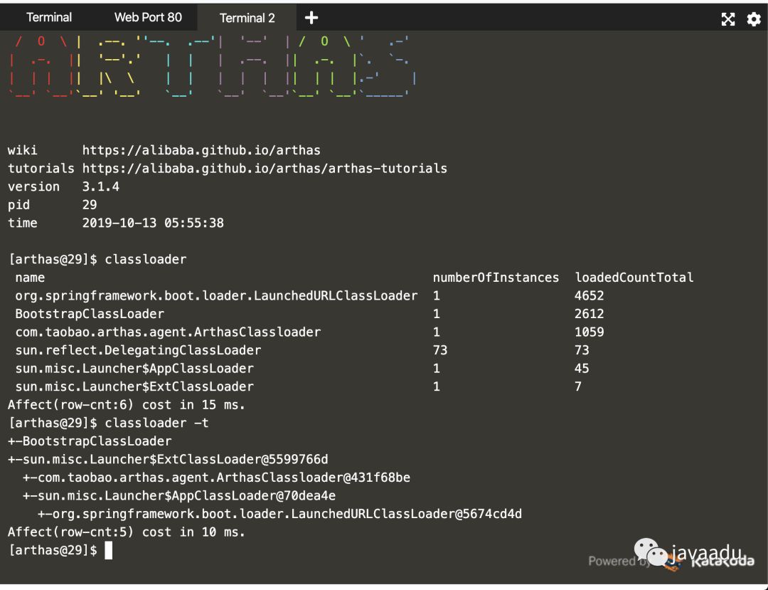 输入classloader -t后,展示了当前应用中类加载器的层次结构,可以看出,BootStrap ClassLoader确实在类加载器体系的顶层,接下来是扩展类加载器,再然后是应用类加载器,这里还有一个ArthasClassLoader,是Arthas自己实现的一个自定义类加载器。