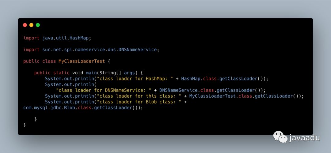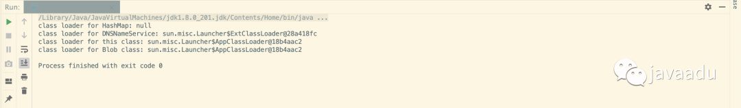 在下面的代码中,java.util.HashMap是rt.jar包中的类,因此它的类加载器是null,DNSNameService类是放在ext目录下的jar包中的类,因此它的类加载器是ExtClassLoader;MyClassLoaderTest的类加载器就是应用类加载器。