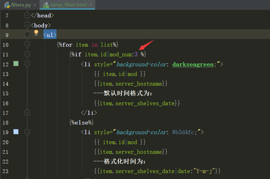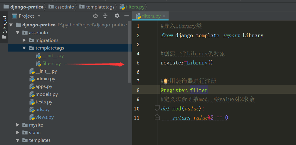 过滤器就是python中的函数,注册后就可以在模板中当作过滤器使用,下面以求余为例开发一个自定义过滤器mod。