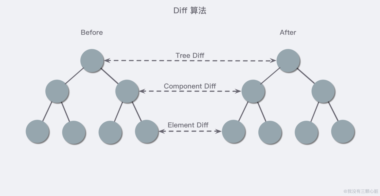 - Tree Diff: 新旧两棵 DOM 树,逐层对比的过程,就是 Tree Diff,当整颗DOM逐层对比完毕,则所有需要被按需更新的元素,必然能够找到;