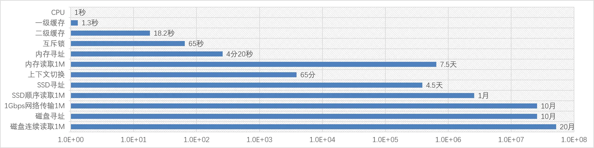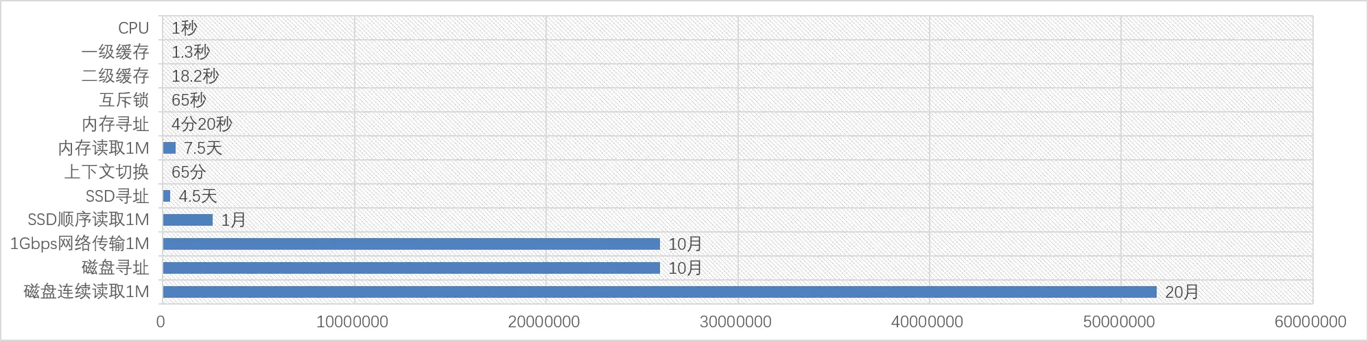 CPU绝对称得上是“闪电侠”,因为它们做事都有自己的一套时钟。我们故事的主人公是一个主频为2.5GHz的CPU,如果它的世界也有“秒”的概念,并且它的时钟跳一下为一秒,那么在CPU(CPU的一个核心)眼中的时间概念是啥样的呢?