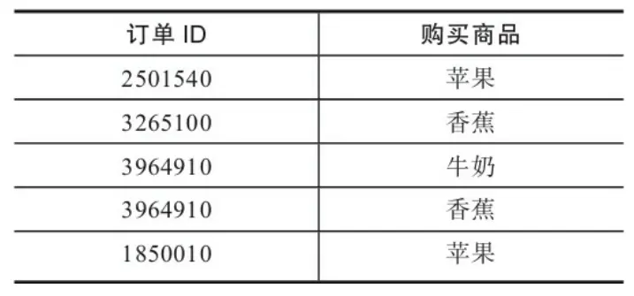- 第一种是事务型交易数据,典型的数据格式是每个数据行以订单 ID或客户ID作为关联分析的参照维度,如果同一个订单内有多少个商品,那么将会有多个数据行记录,如下图。