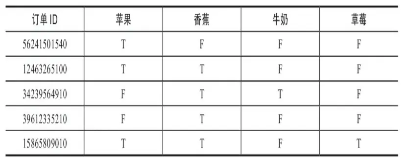 - 第三种是真值表格数据,每个数据行是每个订单ID或客户ID,列是每个要关联项目的是否购买值,通常以T或F来表示,如下图。