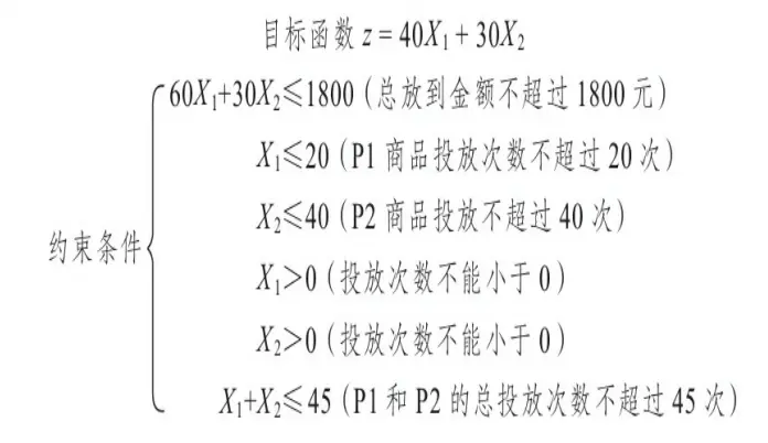 为了解决问题,我们假设P1和P2两种商品的投放次数分别是X1和X2,最大化销售毛利为z,此时: