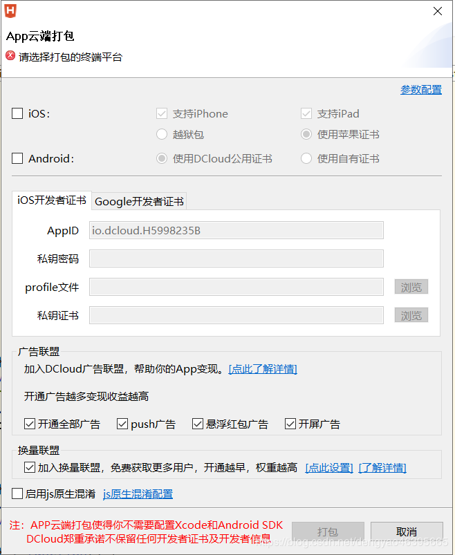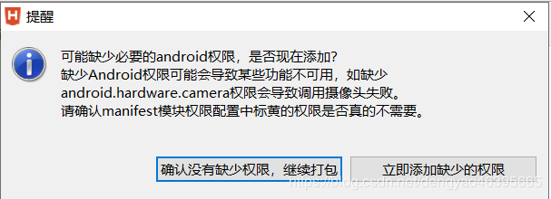 8.提示信息不管,直接点击确认没有缺少权限,继续打包