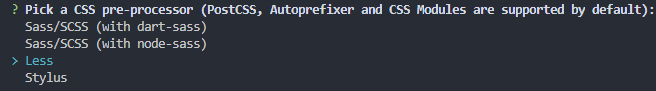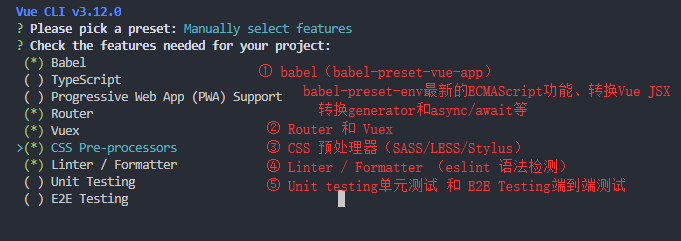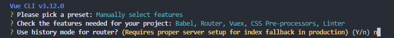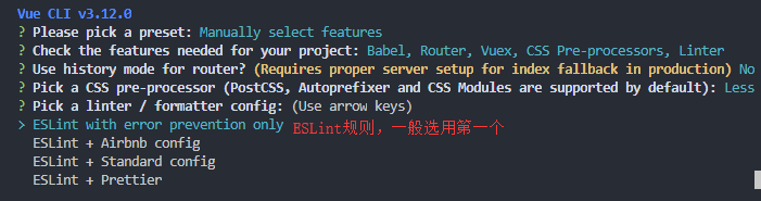 $vue create 项目名称(遵循npm包名称规范:数字或小写字母)- 配置:(以 vue create project为例)