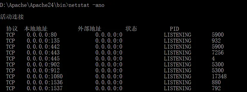 netstat -ano查看被占用的端口: