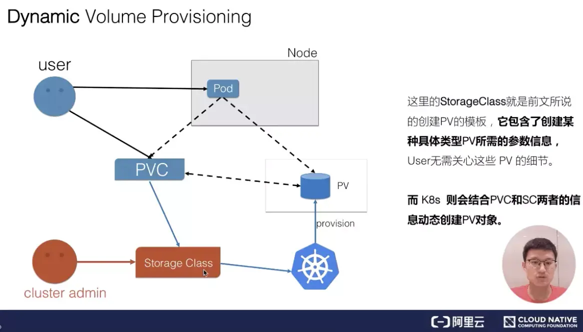 这些参数是通过 K8s 创建存储的时候,需要指定的一些细节参数。对于这些参数,用户是不需要关心的,像这里 regionld、zoneld、fsType 和它的类型。ReclaimPolicy 跟我们刚才讲解的 PV 里的意思是一样的,就是说动态创建出来的这块 PV,当使用方使用结束、Pod 及 PVC 被删除后,这块 PV 应该怎么处理,我们这个地方写的是 delete,意思就是说当使用方 pod 和 PVC 被删除之后,这个 PV 也会被删除掉。